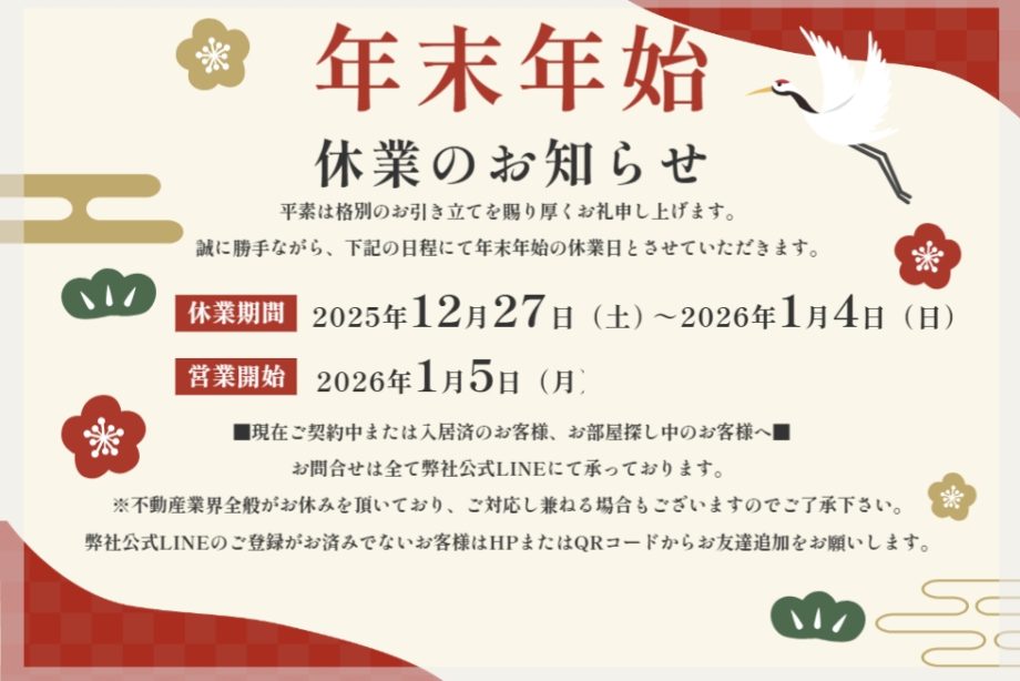 平素は格別のお引き立てを賜り、厚く御礼申し上げます。 下記期間を休業とさせていただきます。 休業期間:2025年12月27(土)~ 2026年1月4日(日) ……